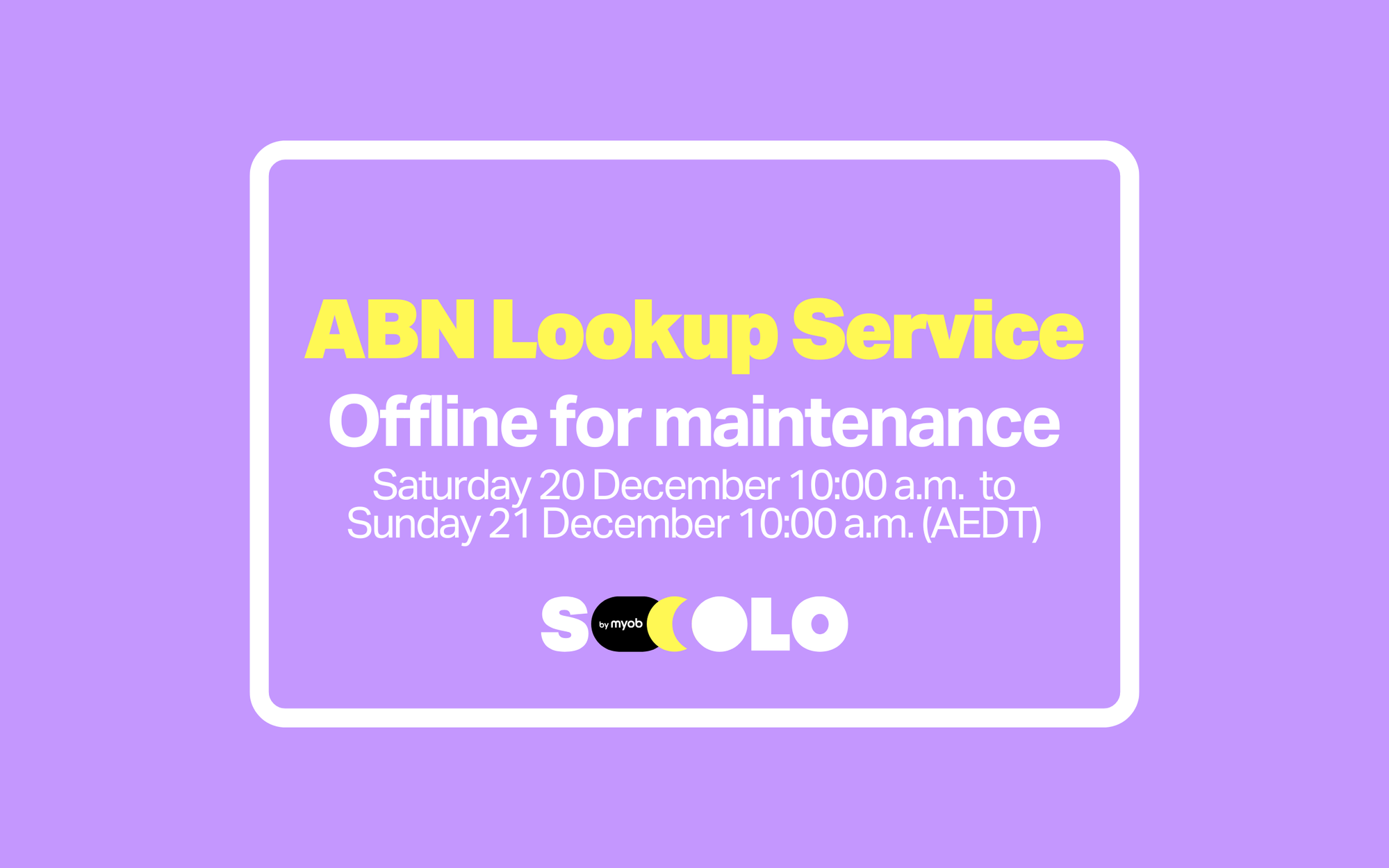 Heads up, Solmates: the Australian Government's ABN Lookup service is clocking off for a bit of scheduled maintenance from Saturday 20 December 10:00 a.m. to Sunday 21 December 10:00 a.m. (AEDT).