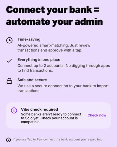 Not sure if your bank can connect to Solo? Go to Connected Accounts > Add Account to find the bank compatibility checker. It’ll link you to a help page so you can easily check before setting up a bank feed.