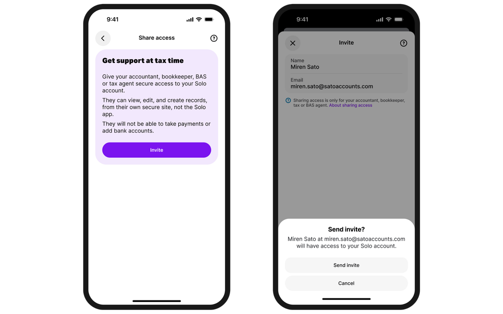 Open Solo and go to More > Shared Access > Invite Accountant/Bookkeeper > Pop in their email and hit Send Invite! They get a secure link to view your Solo data in their browser and you’ll get a confirmation email when they sign in.