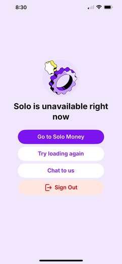 If you get the Solo is unavailable now screen, then signing out and restarting the app usually does the trick, but of course, if it's being persistent then you can message us by tapping "Chat with us"