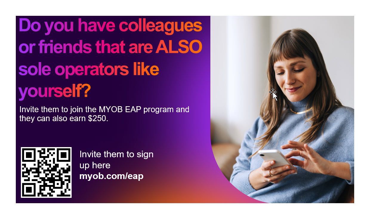 Be sure to invite them and they can earn a $250 gift card. All they need to sign up is; operate in Australia with an active ABN, have no employees and preferably offer services to their customers.