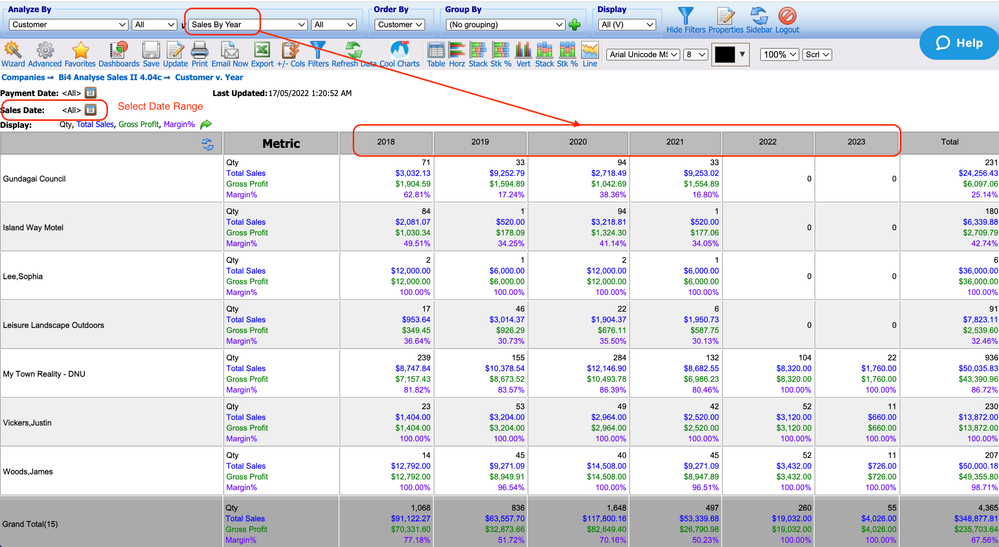 Below is a simple Multi year Sales by Customer, this could easly be changed to Sales by Item, Brand, Customer Channel, Postcode, State etc.