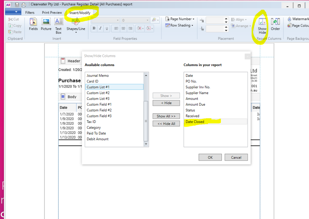 Yes, it is possible to get the closed date on Purchase Register Detail report.If you click on Insert/Modify and then Show/Hide, you will get a list of Available columns from where you can choose "Date Closed" and show it under "Columns in your report". Similarly, you can show or hide any columns from this list according to your requirement.