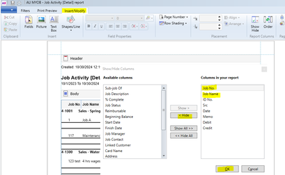 - In the insert/modify settings, you can choose to hide specific columns. Locate the columns for Job No. and Job Name and hide them. This will remove these columns from the report view
