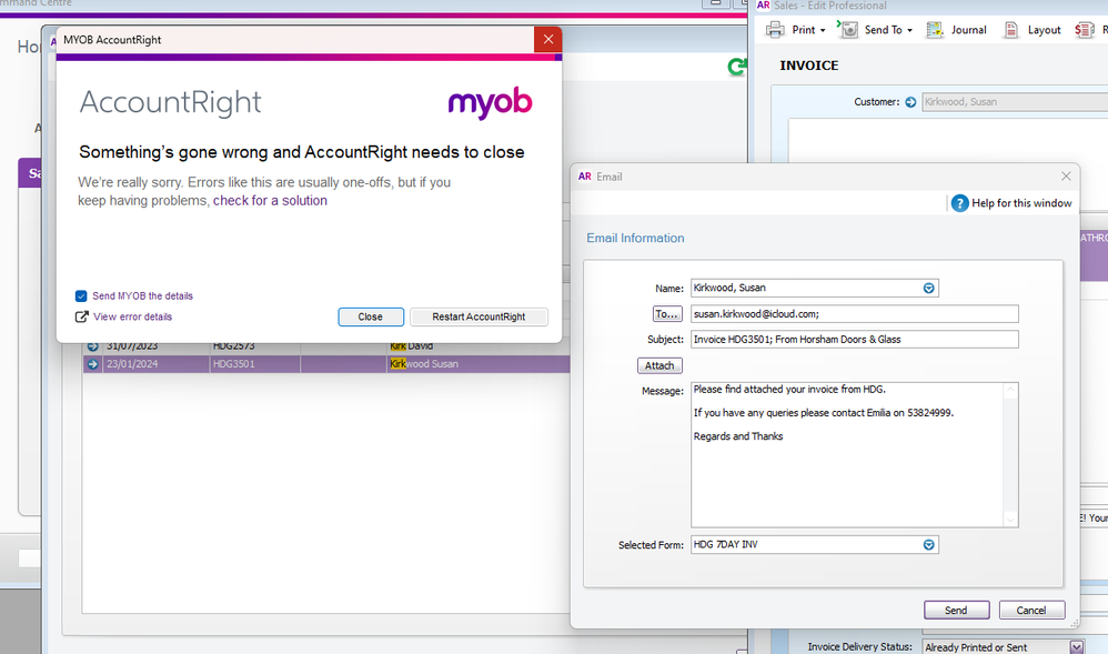 I understand how frustrating this issue can be. To resolve it, I recommend starting by clearing your AccountRight cache to fix any software discrepancies (Clearing the AccountRight Cache). Additionally, please visit this help page for more troubleshooting steps. Email troubleshooting