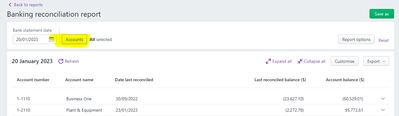 I noticed that the last reconciled date for 1-1111 is 23/1/2023, and the bank statement date selected on the Banking Reconciliation report is 31/1/2023. If there are no outstanding transactions to be reported as of the statement date, the account will not appear on the report.