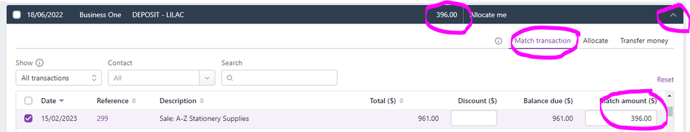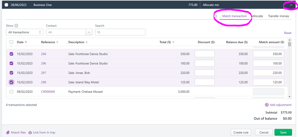 To match mutiple invoices to one bank transaction click on the expand arrow>>Match transaction>>select the invoices included in the payment>>Save: