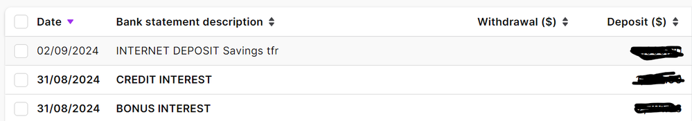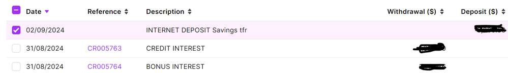 The item above the two interest deposits is also a savings deposit, which shows as a deposit in both the Bank Transactions and the Reconcile Accounts pages.