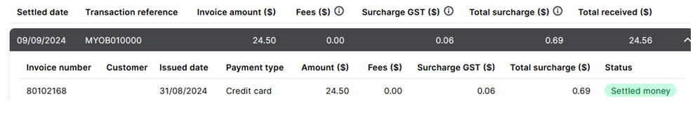 So the real problem is, the MYOB Transaction into our bank was $24.56, but the invoice amount was $24.50, so it's understandable that the auto matching didn't work because they paid us 6 cents more than expected. But the question, is how the heck do we account for this mismatch and how do we write off the 6 cents, but more to the point how does this happen? I can see that there was a surcharge of $0.69 and a surcharge GST of 6cents, so how is that related?