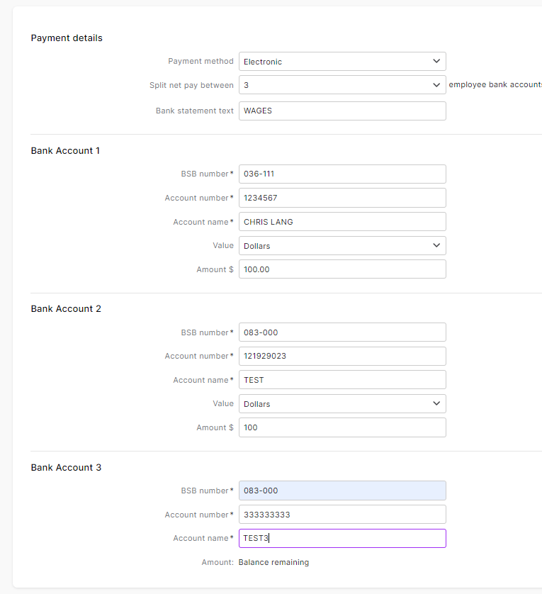I have an employee who needs his wages paid into 3 bank accounts. I havent had any trouble until i had to change one of the accounts. Now it will only split over 2 bank accounts, for example net wages of $944.50 to be split like this.