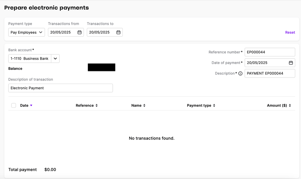 I’ve recorded a pay run today (20/5) for last week’s wages (12/5-18/5). However, the ‘prepare electronic payments’ page doesn’t show any transactions anymore that I can select to download an ABA bank file and pay my staff.