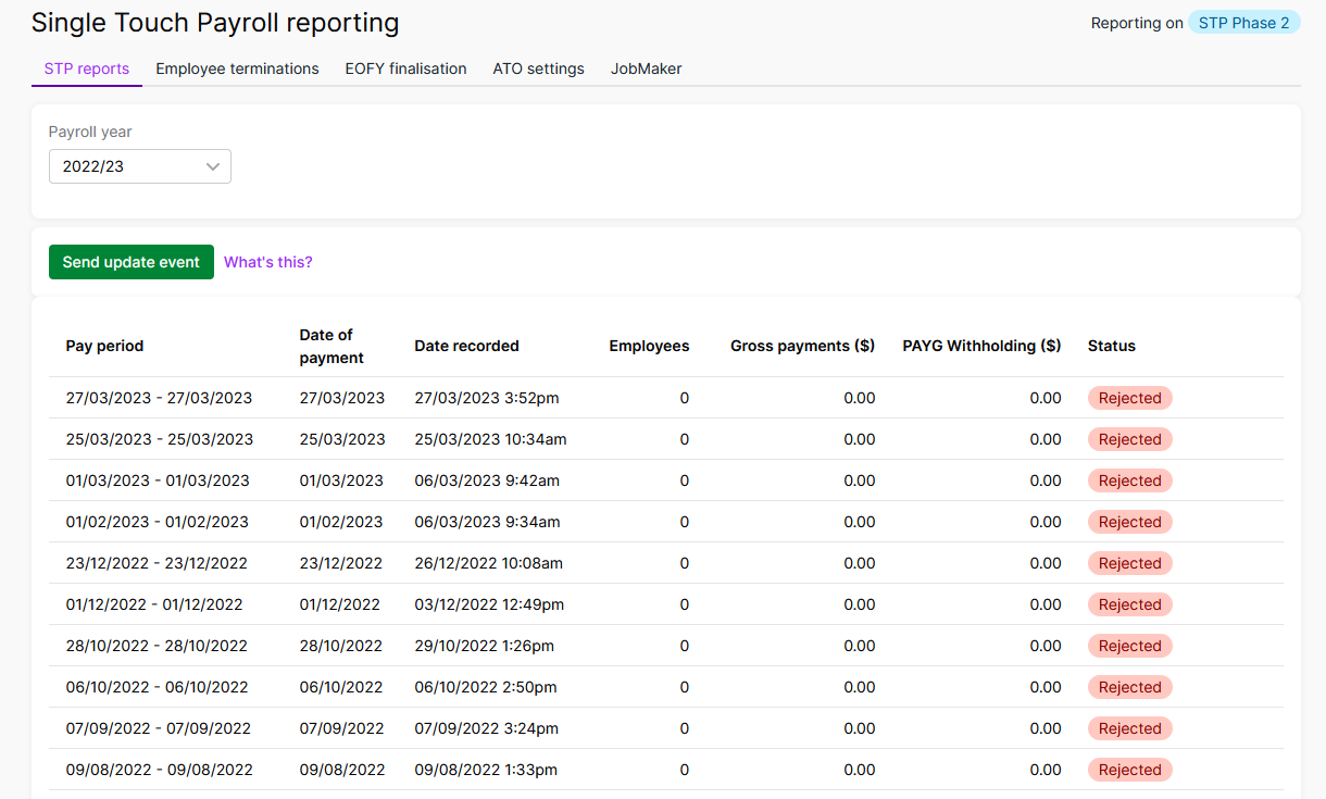 It seems that some set up might be wrong as in the STP reports show "rejected". The payslips in the employee section also shows as rejected.