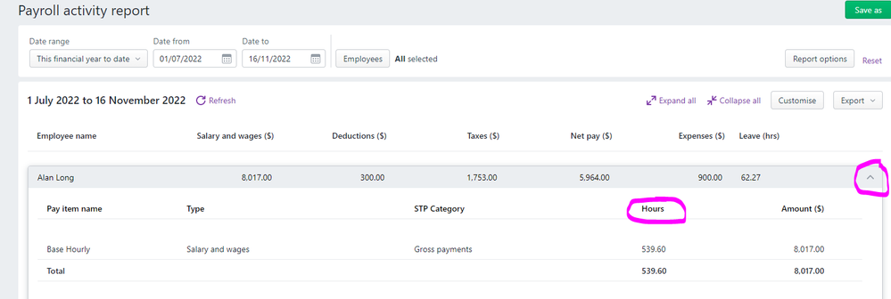 Thanks for your post. Both the Payroll register and Payroll activity reports show the hours and pay items for each employee for a selected period. Click on the expand arrrow to view the detailed report: