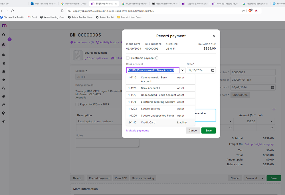Thanks for your post. I would like to check if you're still having this issue?In this type of scenario, we recommend consulting an accountant for an accurate solution. However, here's an idea: to record business expenses paid from your personal account in MYOB, create a new liability account called "Owner's Contributions." Use the Spend Money function, selecting this account in the Pay from Account field, and allocate the expense to the appropriate expense account. Then, enter a General Journal Entry to credit the "Owner's Contributions" account and debit the relevant expense account. This ensures your Profit & Loss statement and Business Activity Statement are accurate.