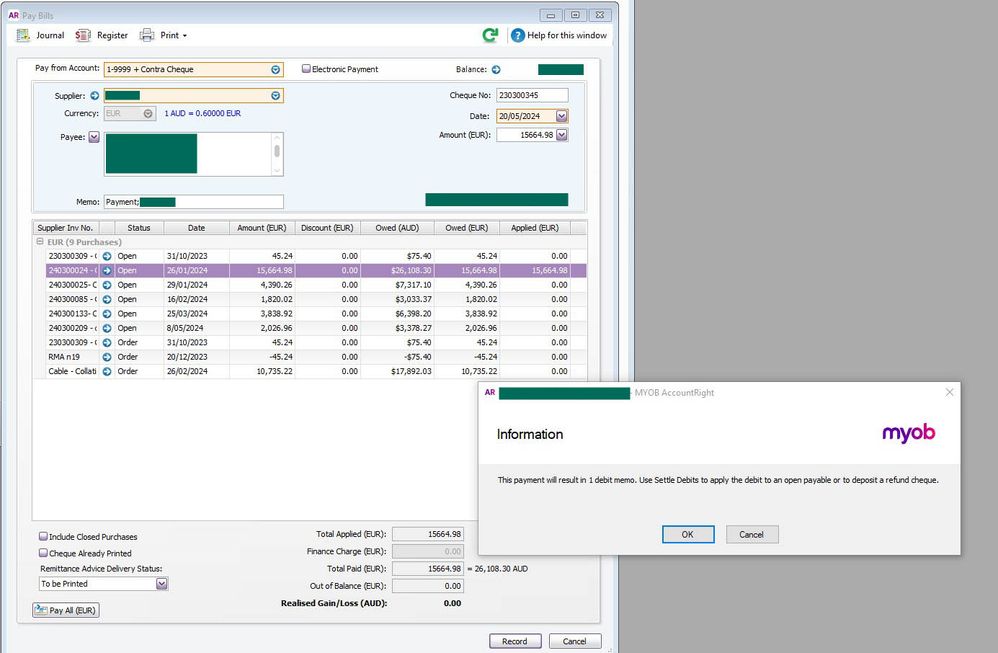 Hello, Trying to pay a bill and receiving the following error. "This payment will result in 1 debit memo...." This message only seems to be occurring with 1 supplier, but happens if I try to pay any outstanding bill from this supplier.