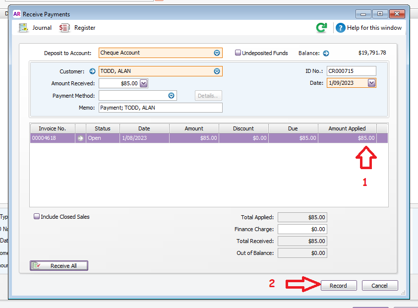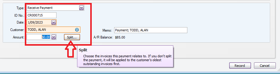 3. Now, enter the amount that has been received and click the [Record] button: