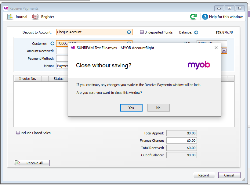 I am in the Bank Register window manually posting entries and when I post a payment from a customer and then open the Split window, allocate the payment against the invoice and click the [Record] button, a dialog box pops up asking you if you wish to close without saving.  So you answer [No]