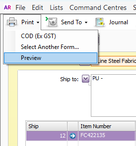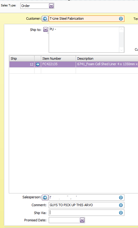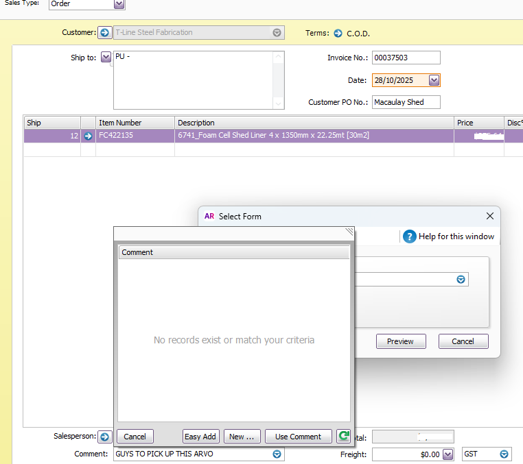 After creating a sales order and entering a custom comment, the comment popup box appears following a print preview.