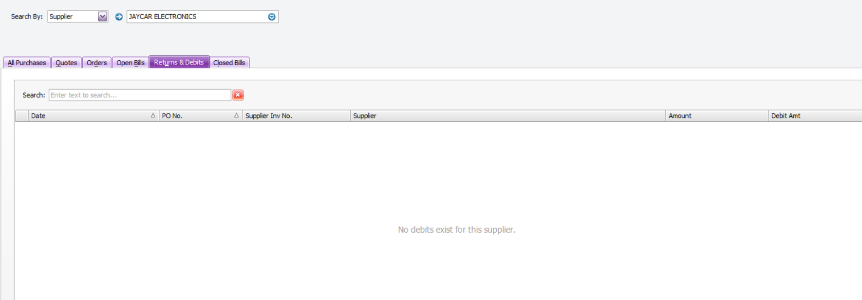 I have a Purchase/Bill that I need to rase a Credit for. When I go into the Purchase Register find the purchase that im needing to rase the credit for then click on the Returns & Debits, nothing shows up?