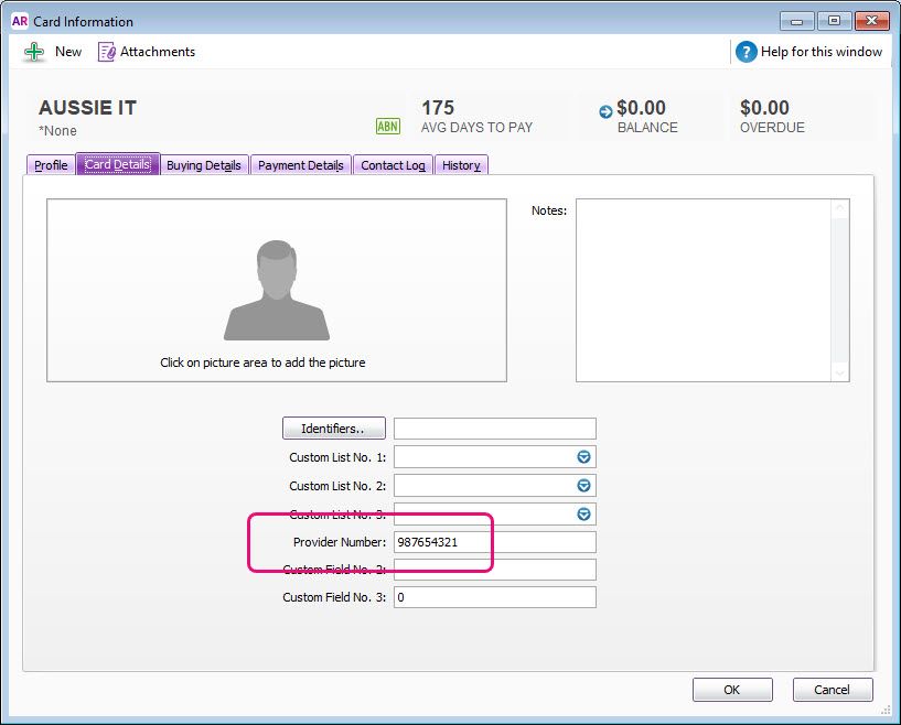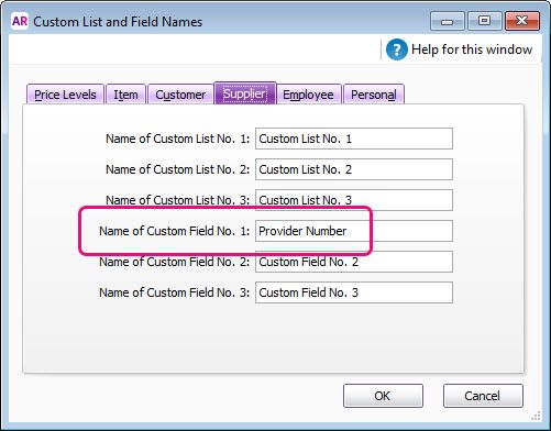 First, you can set up a custom field in your customer or supplier cards to record their provider numbers. You can call the custom field whatever you like - it's just a new field in a card that allows you to store information that's not covered by any of the default fields in a card. Take a look at this help topic for more details on doing this: Custom card fields.