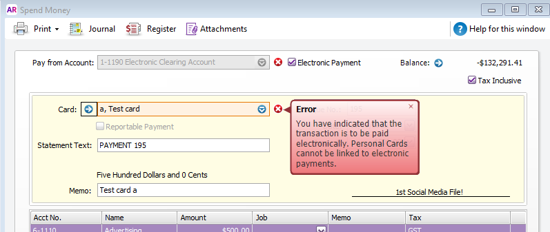 Trying to get to grips with the new software and was reconciling the account and wanted to put a purchase through as owner/shareholders drawings, which was fine before in accountright, but now i get this: A Personal card is currently linked to this transaction. You must firstly link a Supplier or Employee card to this transaction before making the transaction an Electronic Payment. You have indicated that the transaction is to be paid electronically. Personal Cards cannot be linked to electronic payments.