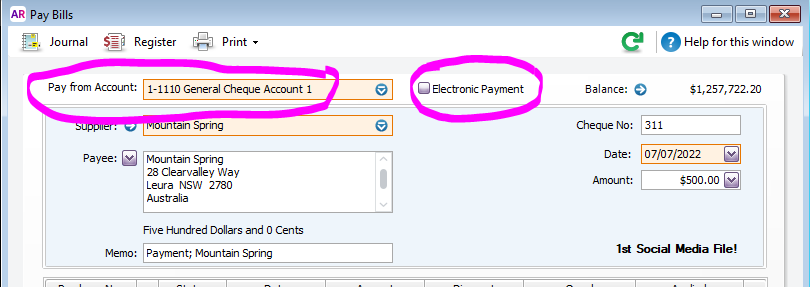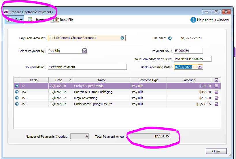 Electronic payments are only needed if you are paying multiple suppliers in one lump sum payment. For example, I'm paying 4 different supplier accounts, I tick them all and click on Bank file to record the transaction and create the ABA file. I then upload the ABA file to the bank and authorise the payment. The bank statement will show a withdrawal of $2184.15 and in AccountRight there will be a matching electronic payment transaction for $2184.15.