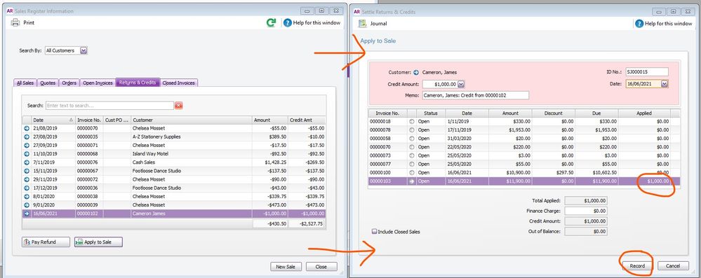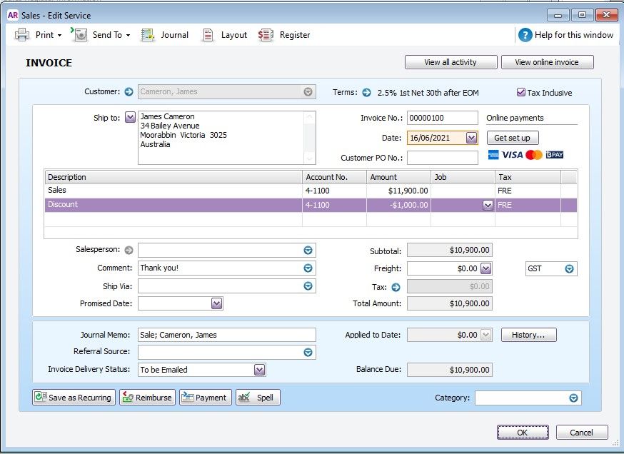 - Record a manual credit note (this is: create a negative invoice for $1000). Then go to Settle Returns & Credits, apply the discount to the sale and click Record.