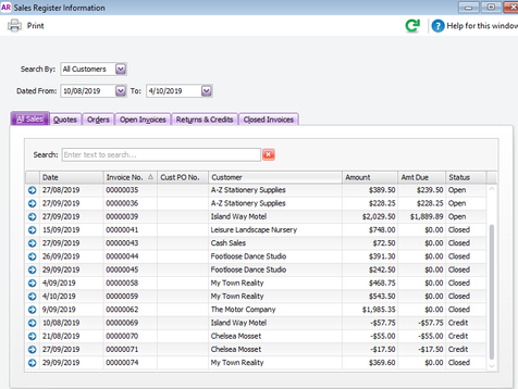 For your other query, how to get a total at the end under the All Sales tab, you click on Print in the top left corner which opens the Sales Register report. This report will give you a total. You can also print that report via Reports>>Sales, it's a handy little shortcut in the Sales Register window.