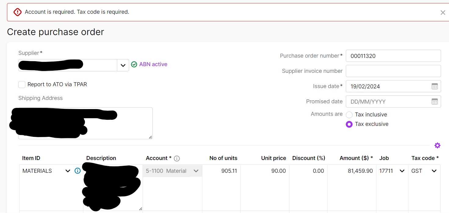 See attached. I posted about this prior and I haven't had the issue for a few weeks so I thought it had been fixed. Issue still happens where a PO cannot be saved or processed due to this tax code error. Happens randomly with any supplier. The most annoying part is MYOB hasn't got a 'save as draft' option like Xero does so once this error happens you have to start all over again.