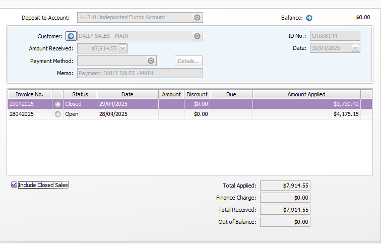 the current status of the sales transaction is showing closed with payment made to the undeposited funds account.