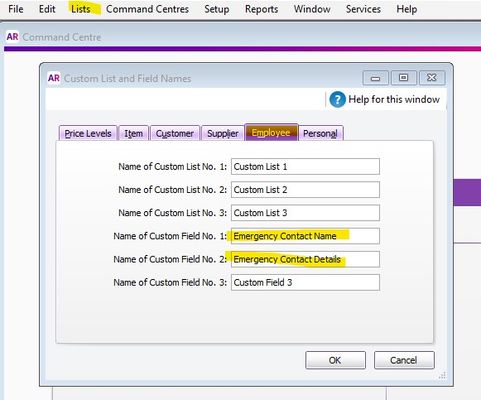 I created the Emergency Contact Name, and Emergency Contact Details fields by going into Lists > Custom Lists and Field Names > Employees (see screenshot below)