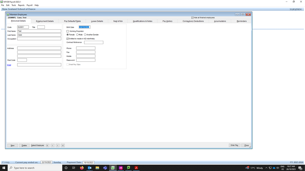 I use the NZ edition of MYOB Payroll which does not have a drop down box for birth date.  I type in the birth date but when I hit enter, it defaults to the current date.