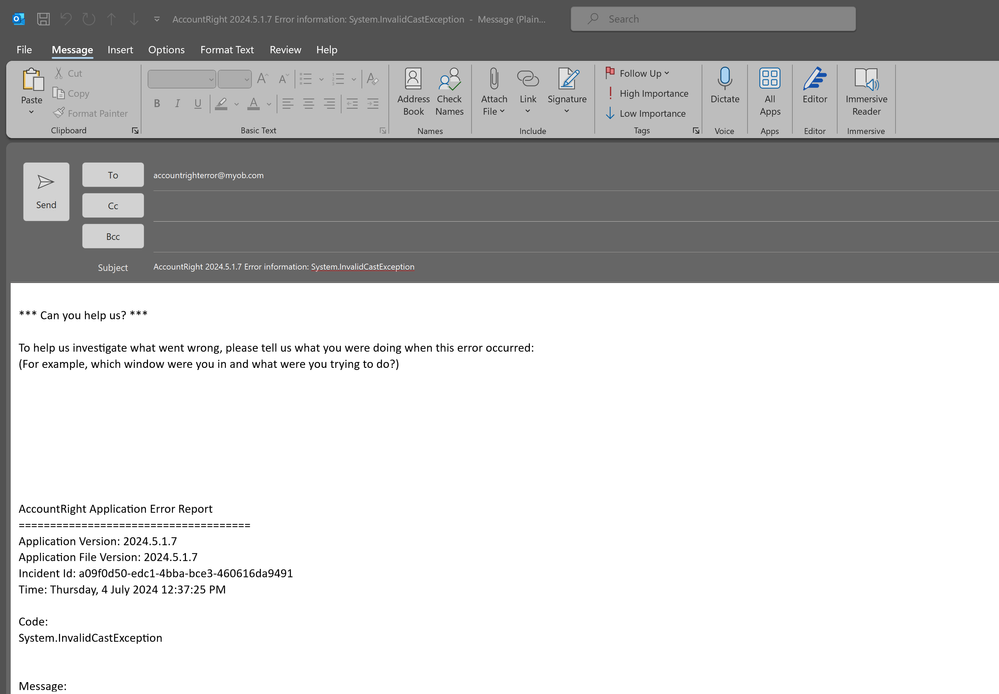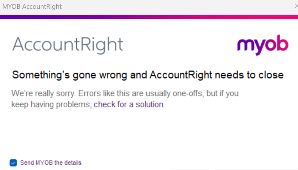 AccountRight Application Error Report