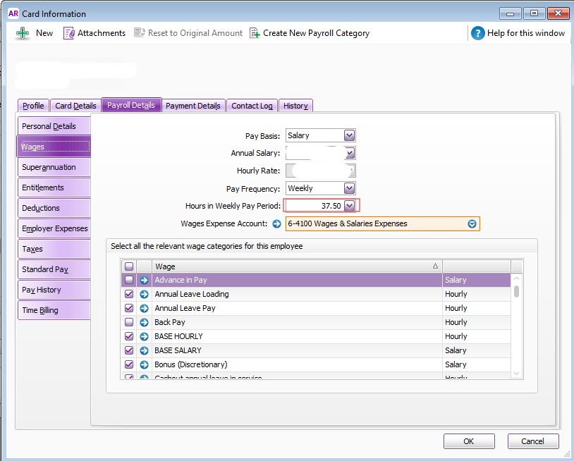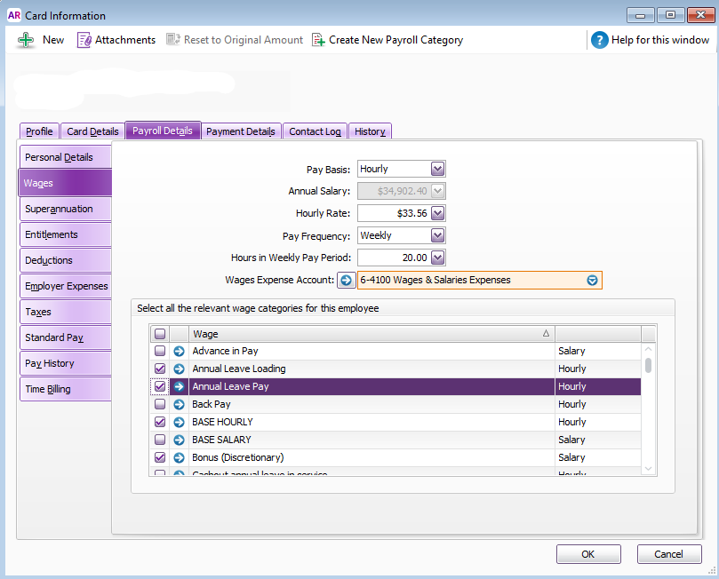 Then to reduce balances when leave is taken, under the Linked Wages Category I ticked the applicable payroll categories e.g. Annual Leave Pay, Cashout annual leave in service, and Unused Annual Leave-ULT.