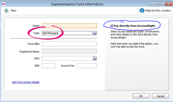 If you have a new employee and need to set up a self-managed super fund, you will need to sign up for Pay Super. And since you're not using Pay Super, you no longer need to tick the "Pay directly from AccountRight" option, as per the screenshot below.