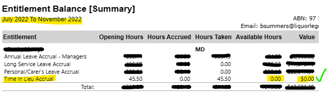 I have one employee who has used up all of their TIL accrual. When I run the entitlement report from 1st July, it shows the correct balance of zero, but when I run the report weekly/monthly it still shows a TIL balance. Their employee card also shows a zero balance.