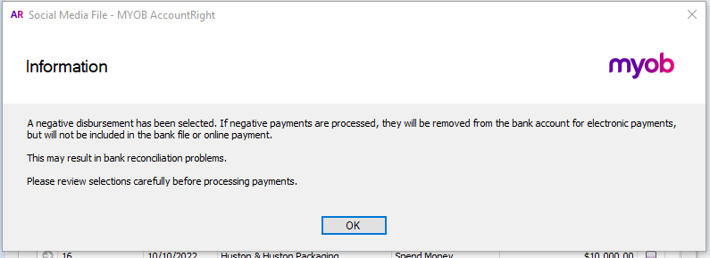 - ABA loaded for payment EP003324 – however unfortunately our bank discarded the negative transaction (ID108) and processed the other 2 transactions – meaning $2973.92 was paid out of the bank.