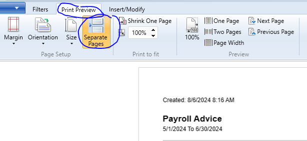 You can always insert page breaks when you generate Payroll Advice. To do this, open the Payroll Advice from AccountRight, go to Print Preview > Click on Separate Pages.
