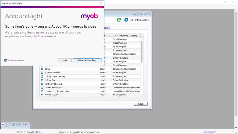 Thanks for sending over the error log. We’re not seeing any known issues right now, but this error can pop up when AccountRight can’t finish a task, often because Payroll settings aren’t fully set up, which can stop that window from loading. No worries, we’ve got this covered on this link.
