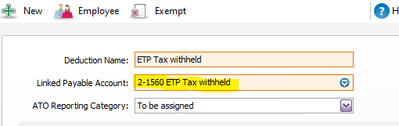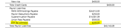 Thanks for the reply. I could see where my accountant was coming from, but as I started ito investigate, I went back to see how I'd set up the activity statement fields and realised the ETP Withheld could only be created as a Deduction.