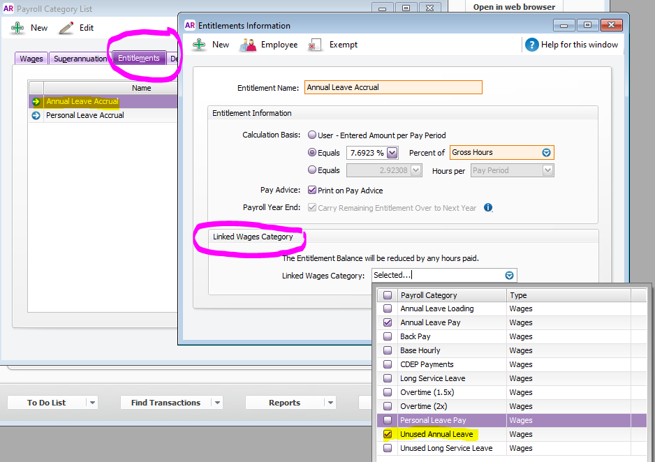 Thanks for your post. If you're trying to reduce the annual leave accrual balance by the hours paid as unused annual leave you need to open the annual leave entitlement payroll category and select Unused annual leave. Having a look at the account linked to your Forum log in you're using AccountRight: