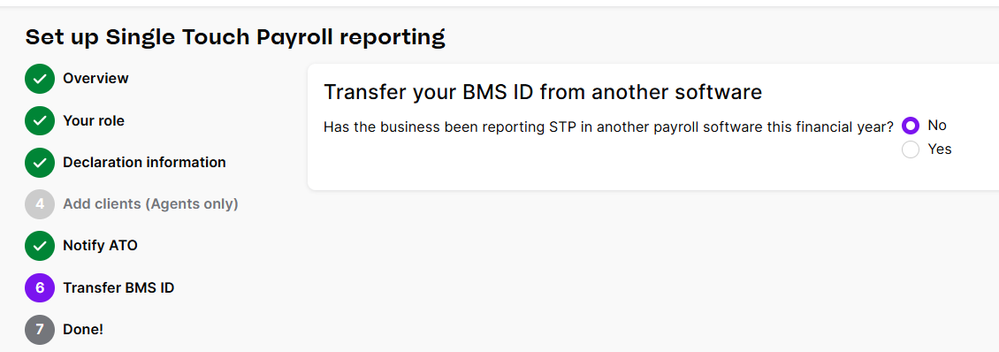 We've notified the ATO MYOB software ID and moved onto step 6 Transfer BMS ID, but we are unsure if we should answer Yes or No for the question: "Transfer your BMS ID from another software. Has the business been reporting STP in another payroll software this financial year?"