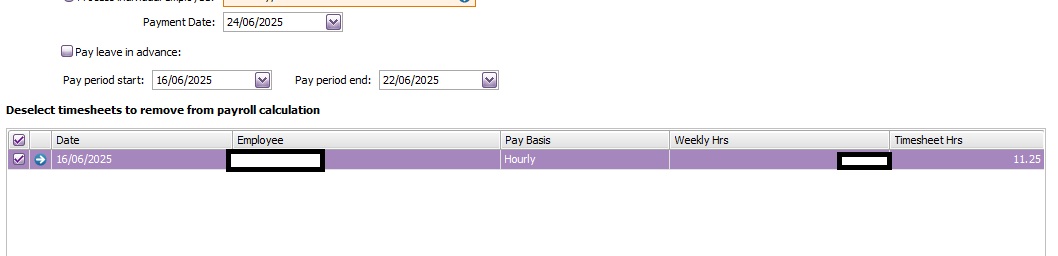 I noted when starting to process pays that the timesheet hours didn't match. Coming up as 11.25 hours, when timesheet is for 25 hours. Looking back into his timesheet, hours area greyed out.