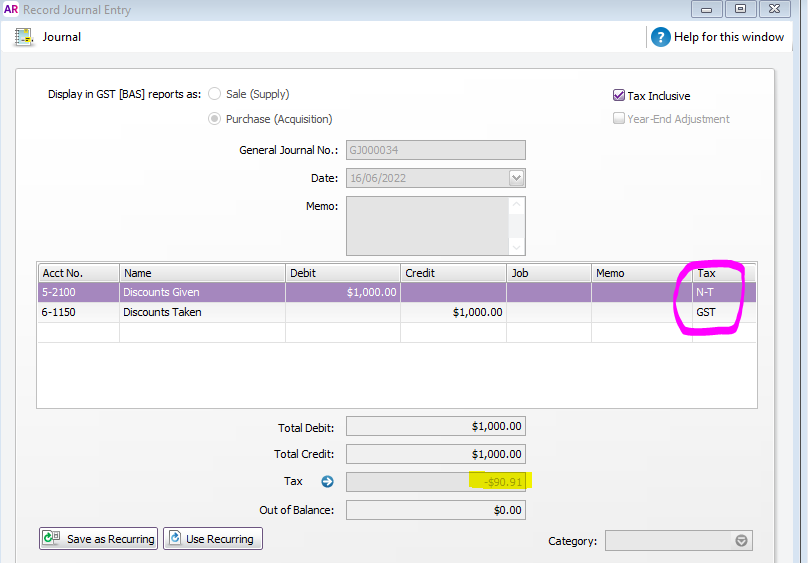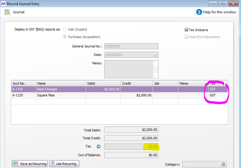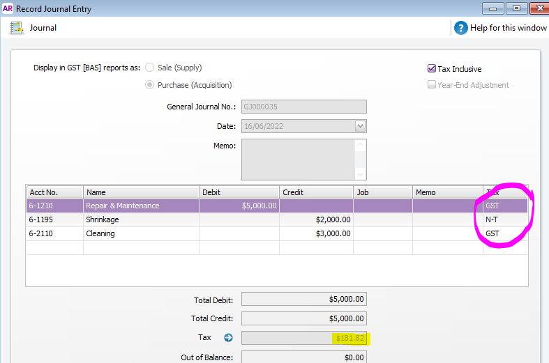 Something to be aware of is that if the same Tax code is selected the GST amounts cancel each other out so the GST amount will be $0.00: