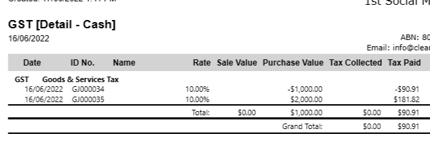 In the GST detail report, GJ000033 doesn't appear as there was no GST on this transaction. Both GJ000034 and GJ000035 are reported: