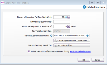 If your AccountRight company file is online, you can try setting up your general payroll information in the web browser version of AccountRight. Just log in at https://app.myob.com/ and go to the settings (⚙️) menu > Payroll settings.