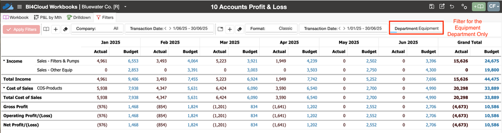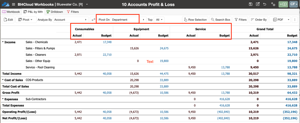 Reports can be filtered by Department, show Departments as columns across the page or summarised as rows in your P&L. Date ranges are completely flexible including This Year/Last year/ MTD/YTD Full Year etc. Any GL Budgets entered into MYOB also pull through and are then also presented by Department.
