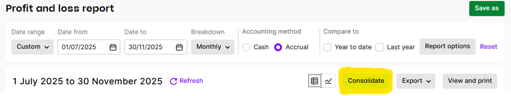 Thanks for the screenshot. You’re spot on that the Consolidate button will combine the selected files for the same report. This option only works when every file is in the same currency as the one you’re consolidating from, so an AU (AUD) file can’t be consolidated with an NZ (NZD) file. If you’re reporting across both entities, you’ll want to run separate P&L reports per currency, then compare or combine the outputs after export if needed. You can check this link for more info.