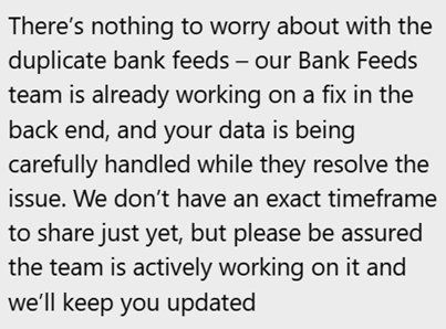 I have duplicate entries in both bank accounts (from different banks) in the bank feeds. Is anyone else having this issue? Aside from "hiding" the transactions, how can I make fix this? It's definitely not a bank thing, I've checked both banks' internet banking and there's definitely no duplicates in the actual accounts...