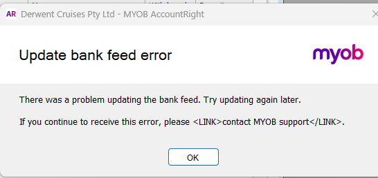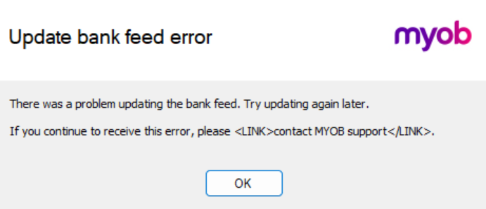 Our team is aware and are investigating an issue where some customers see an “Update Bankfeed error” after clicking Get Transactions. We've posted it on the Status Hub, you can click to subscribe on the top right to stay notified.